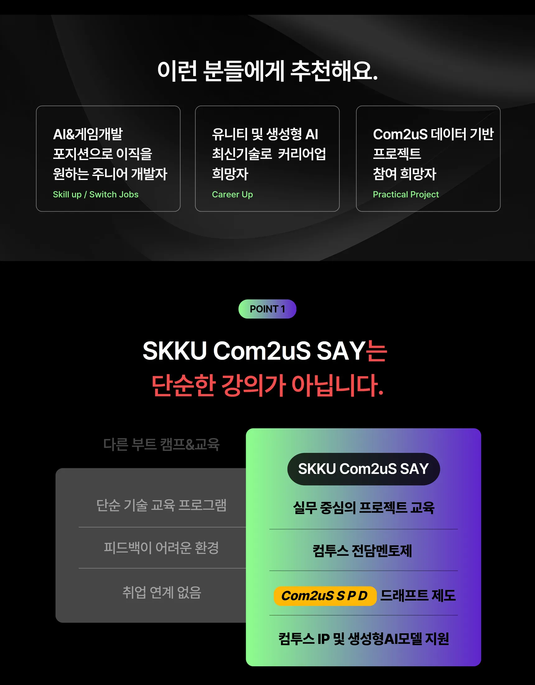 본 과정은 게임 콘텐츠 개발자로 취업을 희망하는, 컴퓨터공학/소프트웨어융합학과 또는 이공 계열의 교육생 및 관련 유경험자 또는 경력자를 우선 선발합니다. 비전공자도 신청이 가능합니다.