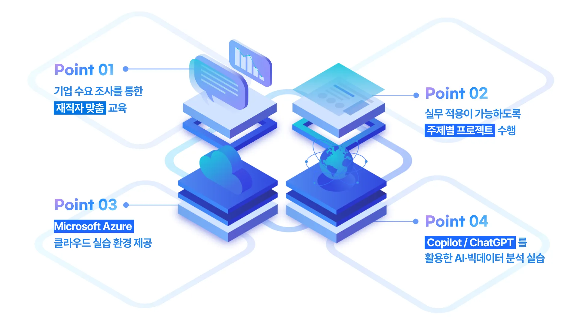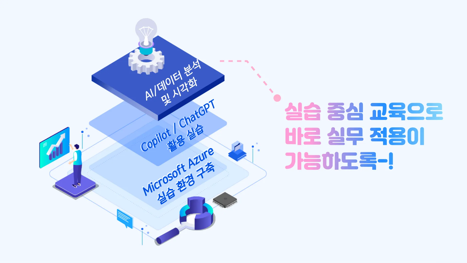 본 교육과정은 단순히 Microsoft의 Azure, Copilot, ChatGPT 기능을 겉핥기 식으로 체험해보는 것이 아닌, 유료 리소스 지원을 통해 실질적인 실습을 진행해보고, 세부 기능들을 활용한 AI 모델링 및 데이터 분석을 진행하는 과정으로 이루어집니다.